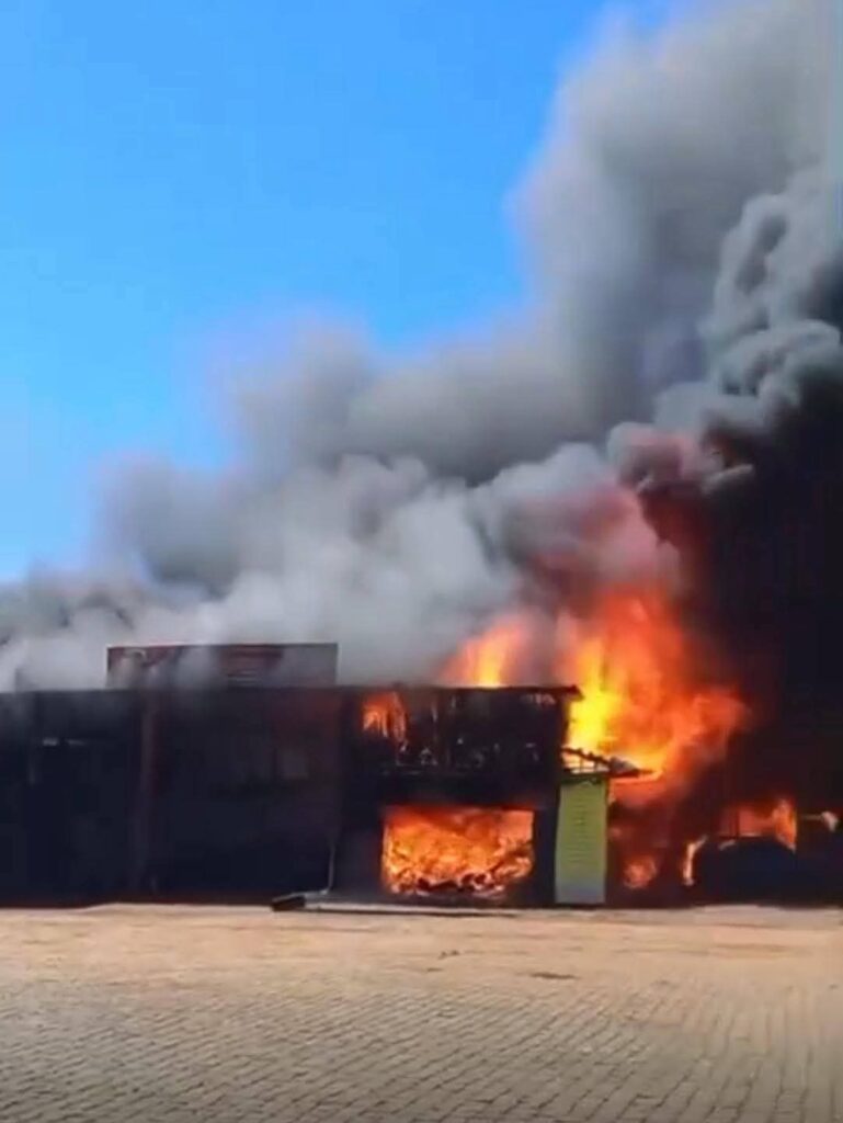 As imagens mostram uma mulher em completo desespero, ajoelhada diante de uma borracharia em chamas, ao lado de um posto de combustível.