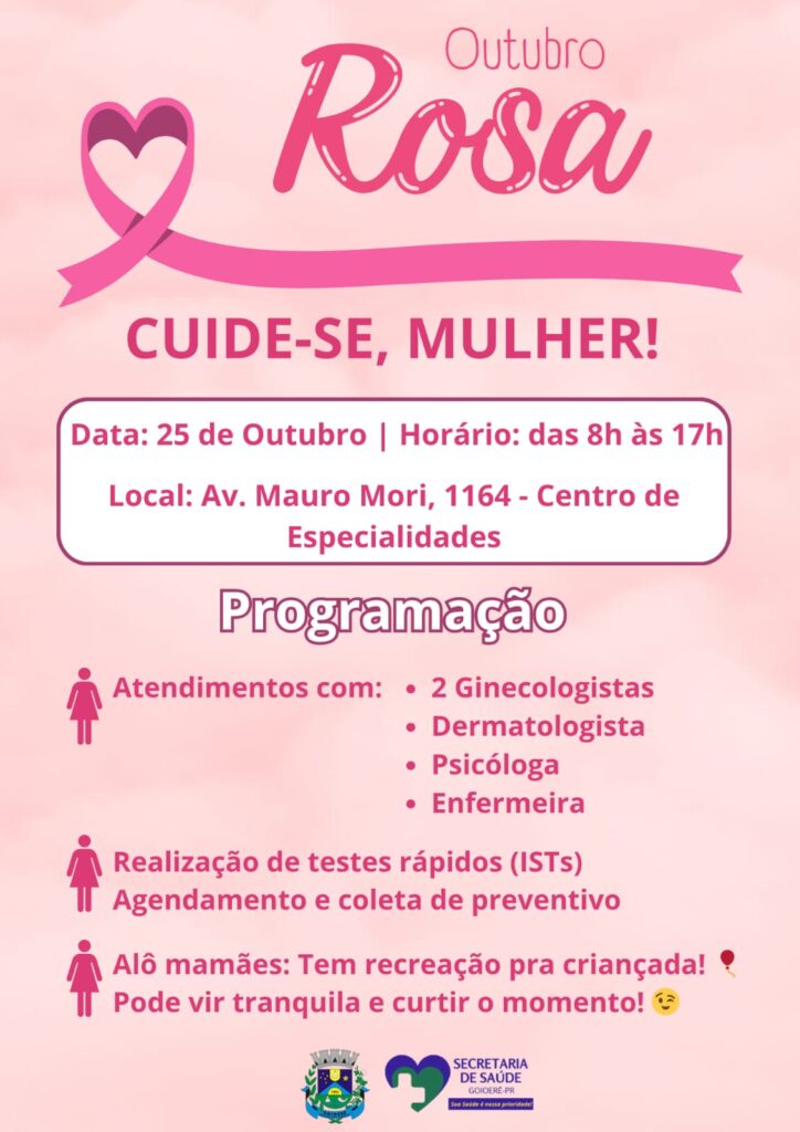 A Prefeitura convida todas as mulheres de Goioerê a participarem da ação e aproveitarem os atendimentos gratuitos. 💗