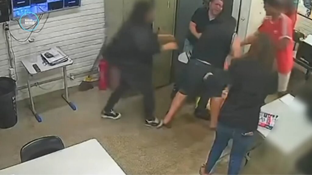 Imagens das câmeras de segurança mostram o momento em que o homem entra na sala da coordenação e parte para cima do professor, desferindo vários socos. Alunos e funcionários da escola precisaram intervir para conter a agressão.