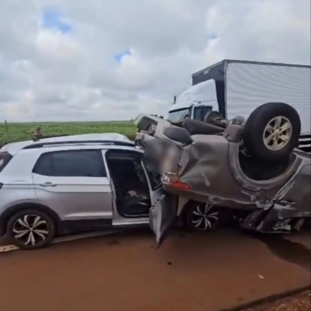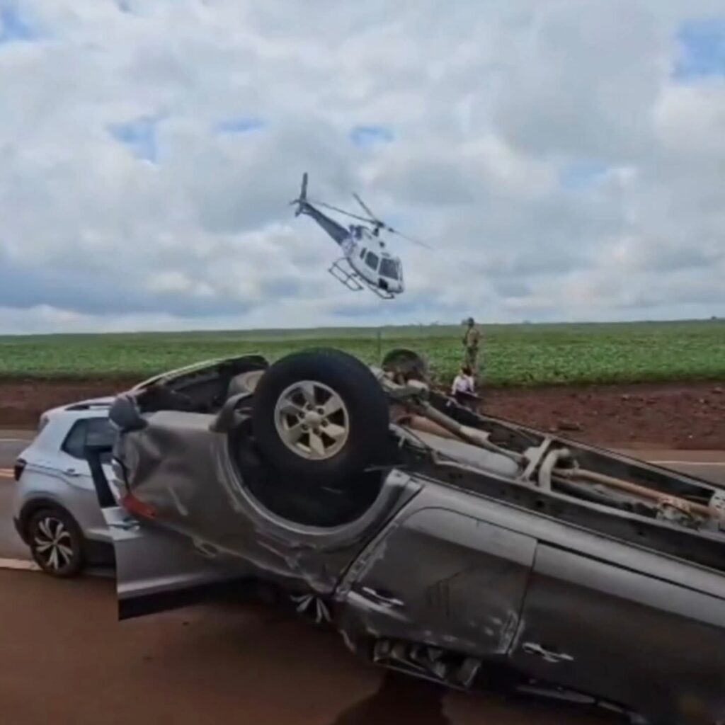 Uma caminhonete Mitsubishi L200, carregada com drogas, capotou durante uma fuga e atingiu um Volkswagen T-Cross onde viajava uma família.
