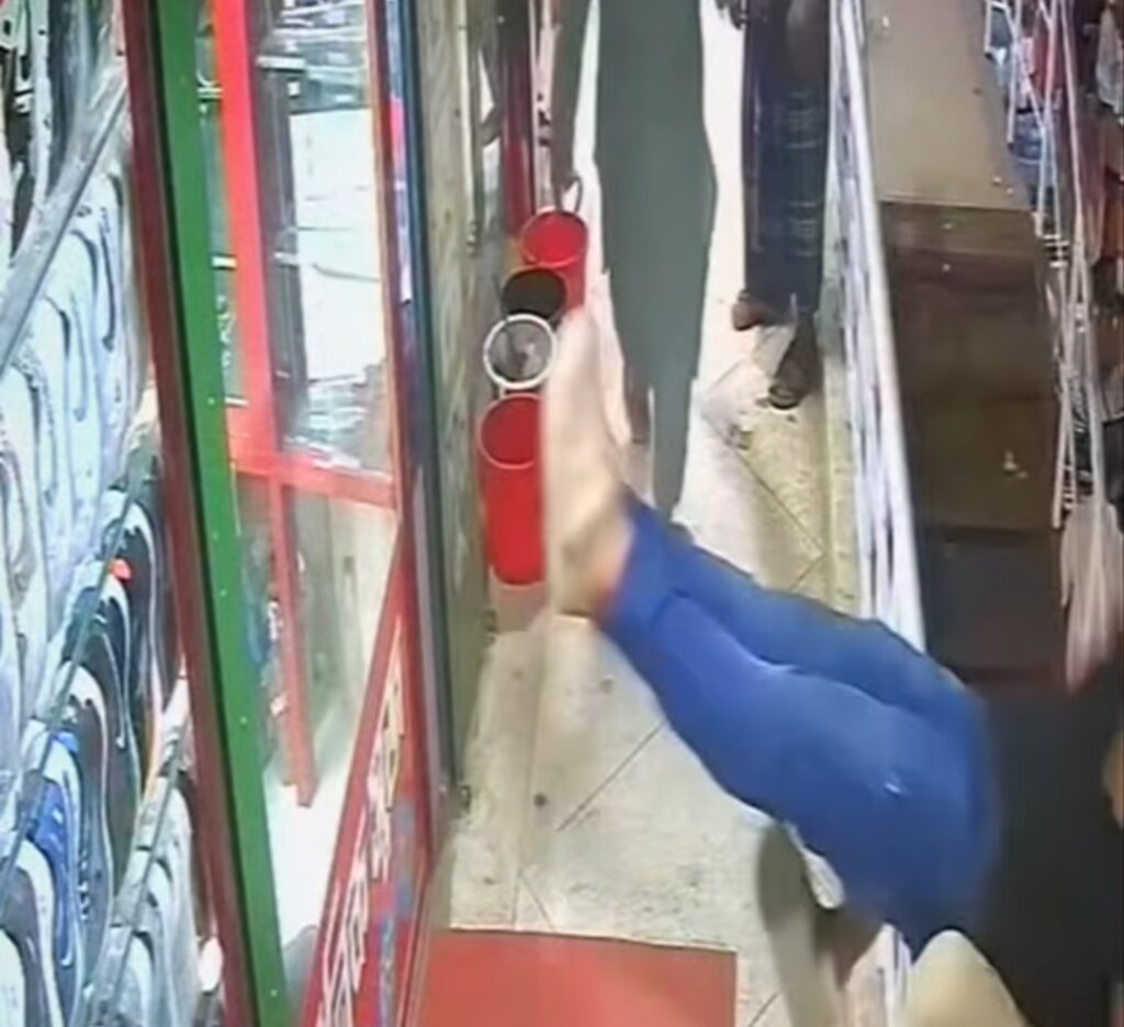 Eles se desequilibraram ao encostar no corrimão e, sem sucesso ao tentar evitar a queda, deram uma cambalhota escada abaixo. As imagens registraram o exato momento do susto ocorrido do lado de fora do comércio